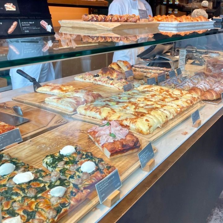 フォカッチャ、ラザニア、クロワッサンやケーキなど、たくさんのフードが売られていました。