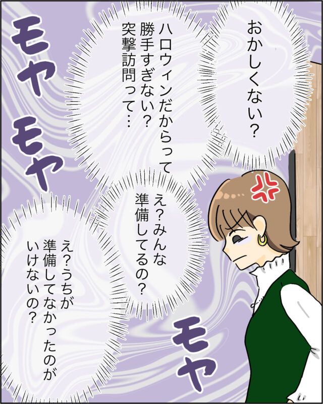 ママさんは「おかしくない?ハロウィンだからって勝手すぎない?突撃訪問って・・・え?みんな準備してるの?うちが準備してなかったのがいけないの?」と心の中で思っていました。