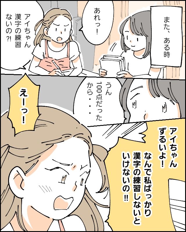 そしてまたある時のこと。家で勉強していた際、突然「あれっ!アイちゃん、漢字の練習ないの!?」と言い出したヨウちゃんに、「うん。100点だったから・・」と答えるアイちゃん。すると「えーっ!!アイちゃんずるいよ!なんで私ばっかり漢字の練習しないといけないの!!」そう言ってヨウちゃんが怒りだしました。
