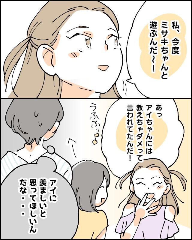 アイちゃんの家にヨウちゃんが遊びに来ていた時のこと、「私、今度ミサキちゃんと遊ぶんだ~!」そう言った後で「あっ、アイちゃんに教えちゃダメって言われてたんだ!」そう言って笑っているヨウちゃん。その言葉を聞いて「アイに羨ましいと思って欲しいんだな」とママは思いました。そしてまた別の日、一緒い勉強していた時のこと、漢字の練習をしていたヨウちゃんが「あれっ!アイちゃん、漢字の練習ないの!?」と言い出したヨウちゃんに、「うん。100点だったから・・」と答えるアイちゃん。すると「えーっ!!アイちゃんずるいよ!なんで私ばっかり漢字の練習しないといけないの!!」そう言ってヨウちゃんが怒りだしました。そのやりとりを聞いていたママは「またやってる」と思いつつ、「アイちゃんはずるい!」アイちゃんへの対抗心なのかマウンティングなのか、子どもとはいえ、聞いているだけでイライラしてしまうのでした。