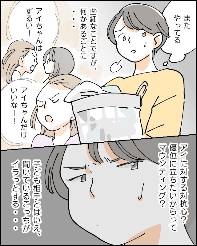 「またやってる・・」と呆れるママは、些細なことだけれど、すぐに「アイちゃんはずるい!」「アイちゃんだけいいなー!」と、アイちゃんに対する対抗心なのか、優位に立ちたくてマウンティングしているのかわからないヨウちゃんの言葉に、子ども相手とはいえ、聞いているだけでイライラしてしまうと感じていました。