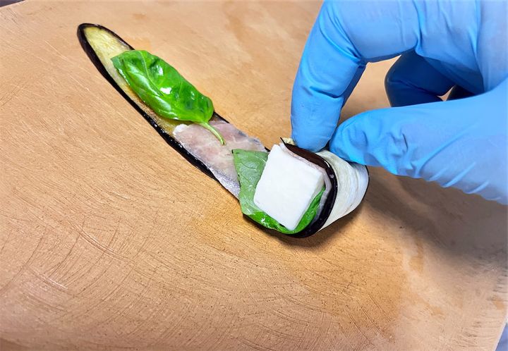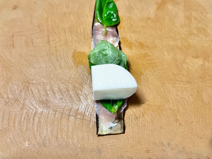 5. なす1枚→生ハム1枚→バジル2〜3枚→モッツァレラチーズ1個を順に乗せ、手前からクルクル巻きます。