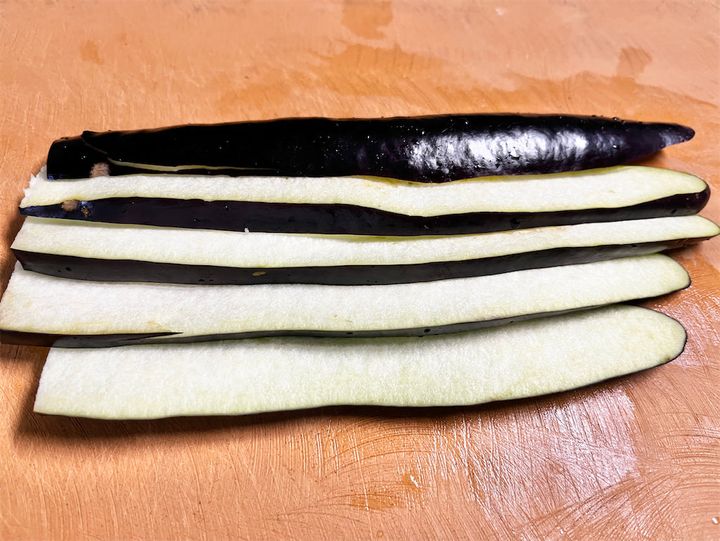 1. なすのヘタを削るように取り、縦に5mmほどの厚さでスライスします。