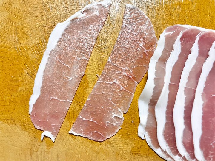 4. 生ハムを縦に半分に切り、なすと同じ幅にします。モッツァレラチーズは、まず厚さを半分にし、次に横に1回、縦に2回切って12等分にしてください。