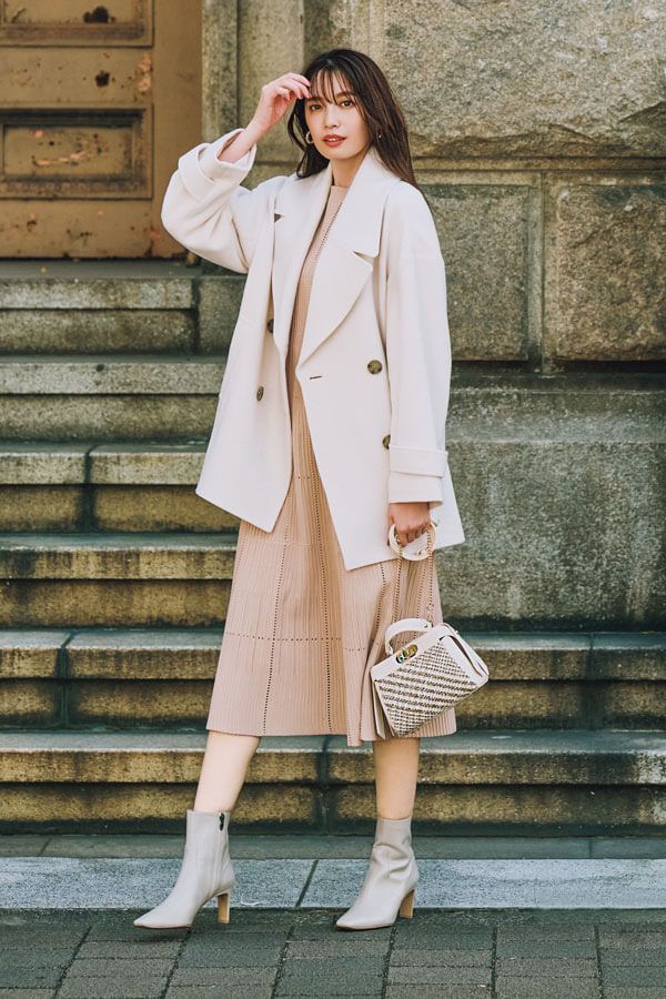 ジャケット感覚で軽やかに羽織れるハーフ丈がコーデの仕上げに最適。シンプルなニットワンピもアウターの効果でよそ行きなきちんと感。