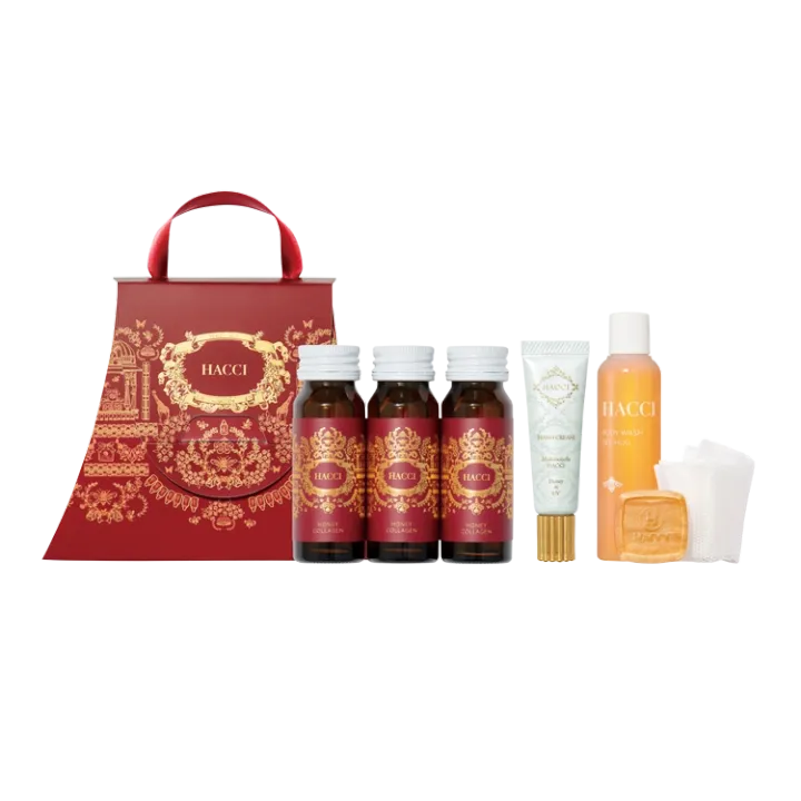 ロイヤルゼリーとはちみつを配合したビューティーエナジードリンクでインナーケア。さらに、保湿力の高いはちみつ配合のボディウォッシュと洗顔石けん、ハンドクリームで、なめらかな肌へケア。はちみつの恵み満載なコフレです。