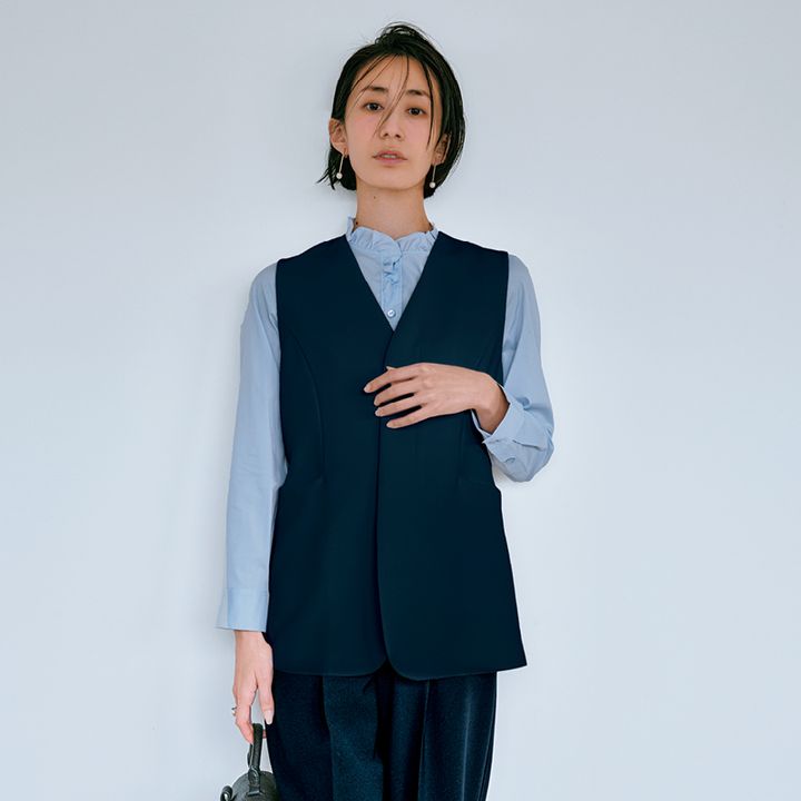 あえて装飾を省いたネイビーのジレは、端正なシルエットが魅力。胸元のV開きや、お尻が隠れる丈感が、こだわりを感じさせてくれます。同系色のブルーシャツとの相性もバッチリ。写真のようにスッキリ着こなすのはもちろん、コサージュやパールネックレスをプラスしてカスタマイズしてもOK!