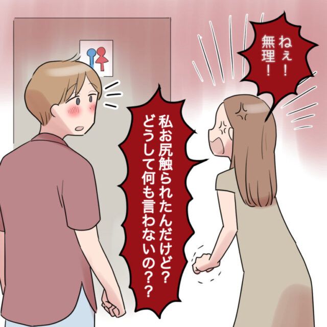 トイレに席を立ったミノルさんを追いかけ、ナオミさんはおしりを触られたことを訴え怒りをぶつけました。「ねぇ!無理!私、お尻触られたんだけど?どうして何も言わないの!?」