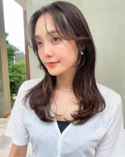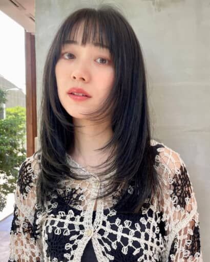 輪郭カバー&若返り効果を狙うには、サイドの髪を顔周りに自然に流すレイヤースタイルのミディアムヘアがおすすめ。