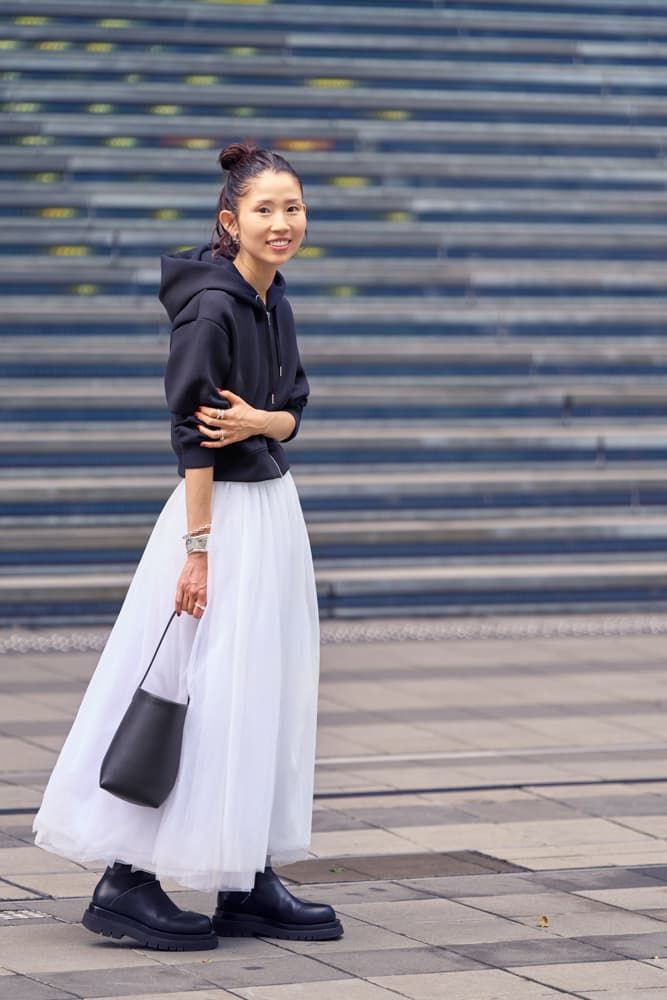 華やかチュールにスポーティな「パーカー」を合わせてバランスよく!