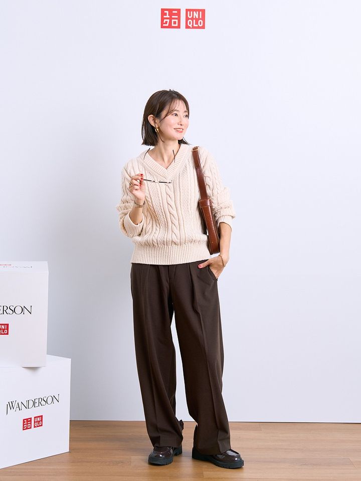 ケーブルVネックセーター¥3,990 2WAYタックストレートパンツ¥4,990(ともにユニクロ アンド ジェイ ダブリュー アンダーソン/ユニクロ)※セーターとパンツはMサイズを着用 メガネ、靴(参考商品) バッグ(私物)
