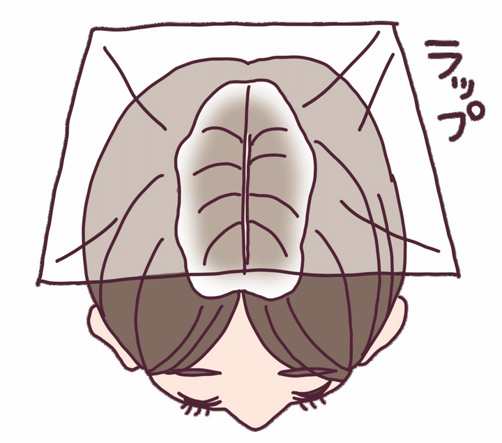 生え際同様、目につきやすいのが髪の分け目の白髪。ここも染料を髪に密着させるため、塗布したら分け目全体をラップかティッシュペーパーでおおいます。