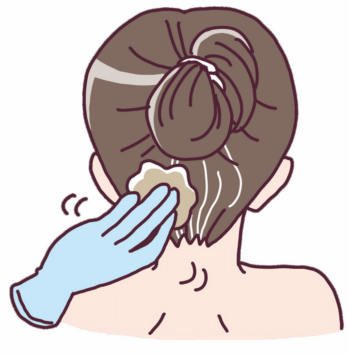 うなじに生えている白髪は、自分では見えにくく、非常に塗りにくい……。こういう場所は手に染料を多めにとって直接塗りつけると、簡単なうえ染め忘れも減ります。