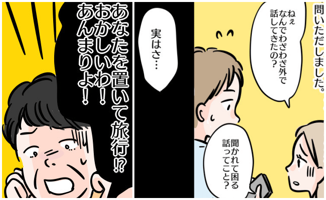 子どもが生まれる前の、新婚時代の出来事です。母と一緒に、母の故郷である沖縄に3泊4日の旅行へ行き、自宅に帰ってきて数日後の夜。夫のスマホに夫の実家から着信が。その場で出ればいいのに、なぜか部屋を出ていく夫。その行動に違和感を覚え、話し終えて帰ってきた夫を問い詰めると……。