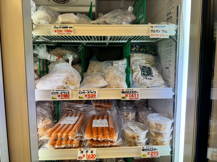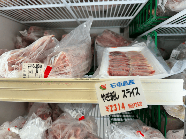 みなさん食べたことありますか?ヤギ刺し。沖縄に行くとかなりの割合で飲食店に置いてあるヤギ刺しを、こちらのお店では買うことができます。おうちでヤギ刺しが食べられるなんて・・・。