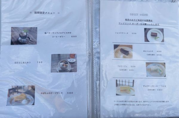 スイーツメニューもあります。 期間限定メニューには、塩バターキャラメルアイスのせコーヒーゼリーや、みたらしあんみつがありました。 名前からすでにおいしさが伝わってきますよね…どうしよう。 あんショコラやずんだチーズケーキも気になります。