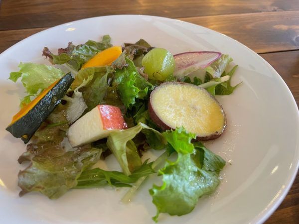 こちらのサラダも美味! 今が旬のりんごやマスカットの果物のほか、さつまいもやかぼちゃなど地元で採れた野菜を中心に使用しているそうです。