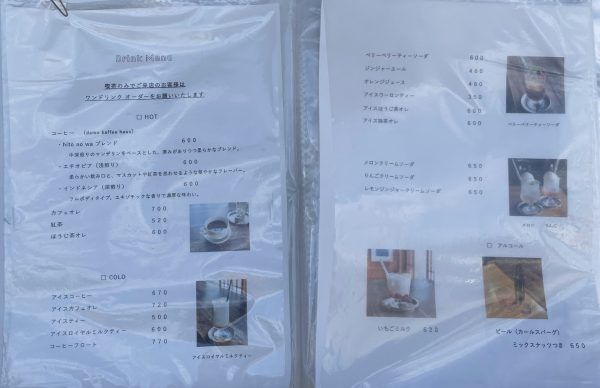 こちらはドリンクメニューです。 コーヒーやカフェオレのほか、りんごクリームソーダやいちごミルクなど、どれもおいしそ~!!