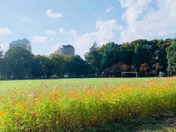 広々とした芝生。 縁には、キバナコスモスやコスモスが色とりどりに咲いていました。 陽に透けて、風にそよぐ光景が本当にきれいです。 向こうには高層の建物が見えますが、公園内は本当に緑が多く、ゆったりとした気持ちになれます。