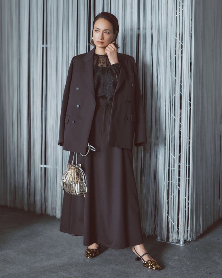 「こちらはブラウン×ゴールドを主軸に、レースで上品さを。全体に落ち着いたカラートーンなのに、地味にならないのは、耳元、バッグ、足元とバランスよく配したメタリックの素材感のおかげ。通勤にも使えるのにこのスーツの汎用性の高さにもうなります」(加藤さん)