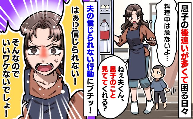 現在、2歳の息子は後追いが多く、料理を作るときは特に大変です。平日はなんとかしていますが、夫がいる休日は夫に面倒を見ていてほしいと頼んでいます。しかし、夫の"面倒の見かた"は信じられない物で……。