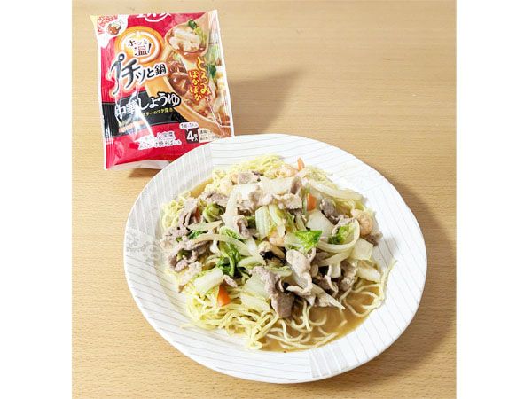 「プチッと鍋」シリーズは濃縮された液体の鍋の素のため、調理時に味が決まりやすく、鍋以外にもさまざまなメニューにも使う人も多いそう。「プチッと鍋ホッと温」は、濃縮タイプであることはもちろん、水とともに加熱するだけで簡単にとろみのついたつゆを作ることができるため、中華丼や八宝菜、あんかけ焼きそばといったとろみの調整に手間がかかるメニューを手軽に作れます。実際に編集部であんかけ焼きそばを作ってみました。