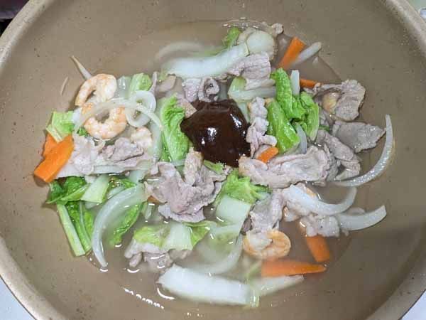 中華麺を油でいため焦げ目をつけたあとお皿に取り出し、同じフライパンで肉や野菜を炒めます。そこにポーション1個と150mlの水を入れて約3分煮詰め、中華麺の上にかけたら出来上がり!