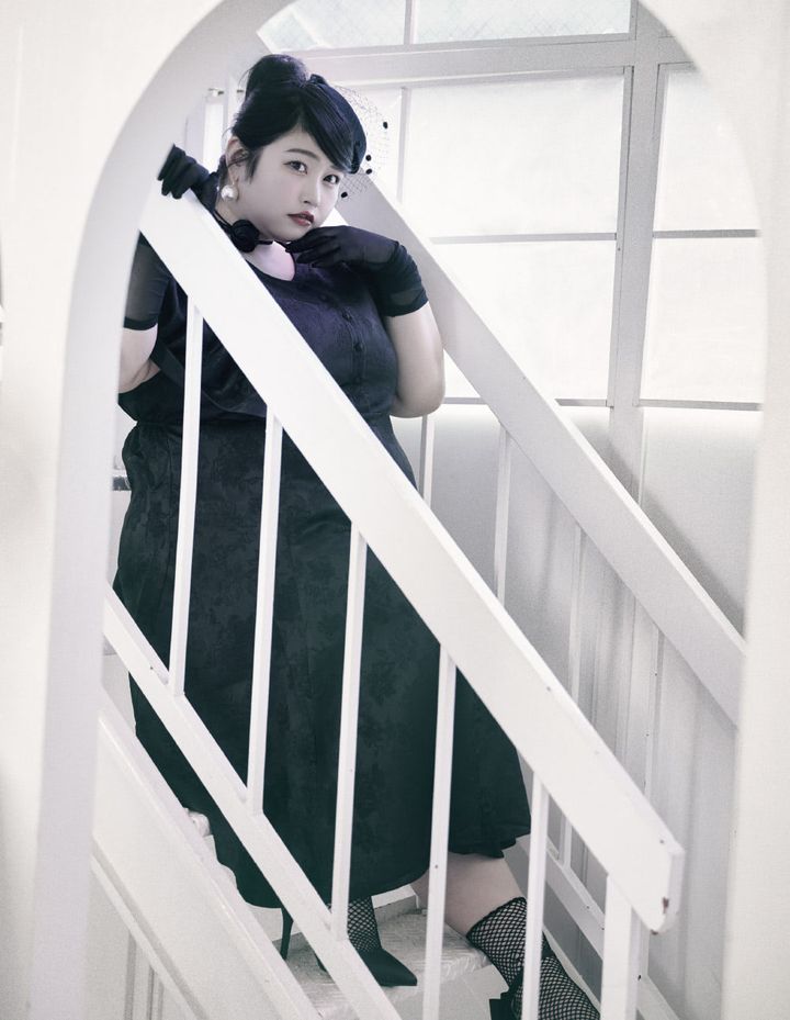ジャガードワンピース L~10L ¥8,789~¥9,669/marun(スマイルランド) ミニハット ¥563、ローズチョーカー ¥326、グローブ ¥371/すべてSHEIN パールピアス ¥2,990/ZARA(ザラ カスタマーサービス) ソックス ¥935/靴下屋(Tabio) パンプス 22.5~25cm ¥2,199/GRL