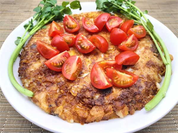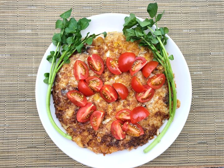10. 火を止めてフライパンに皿をかぶせて返し、ミニトマトとクレソンを飾って出来上がりです。