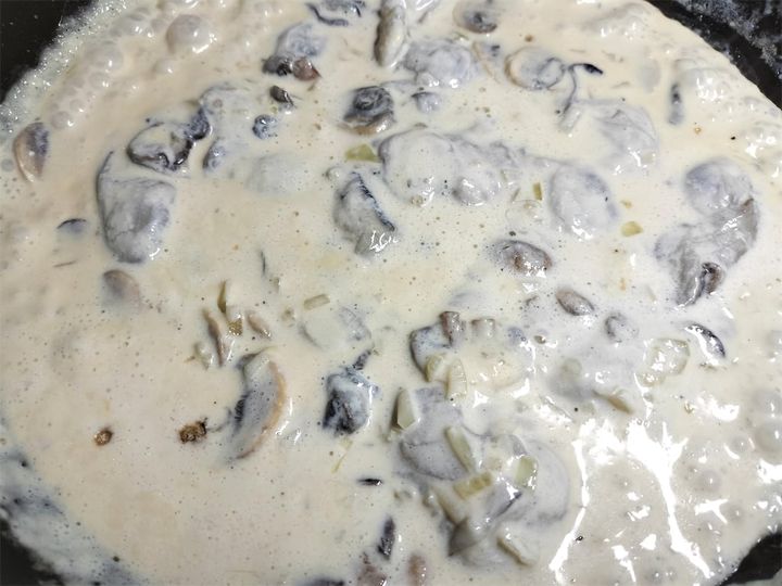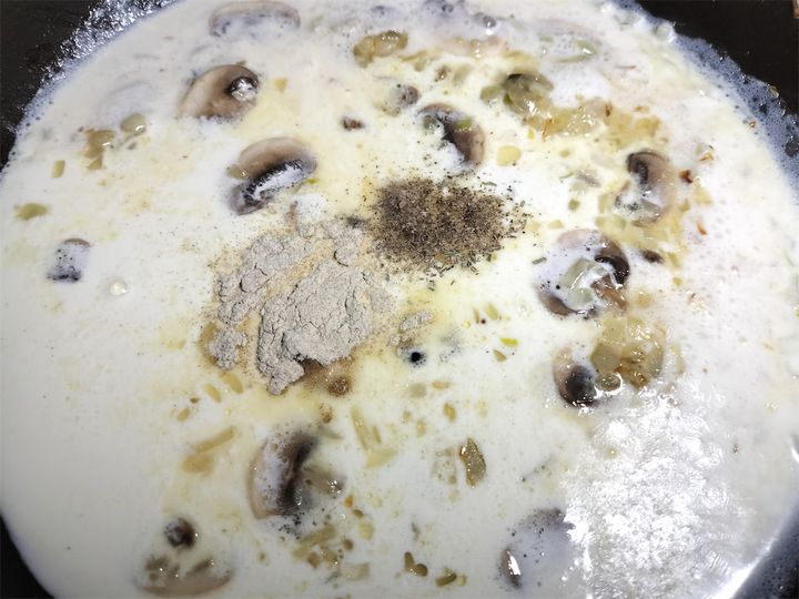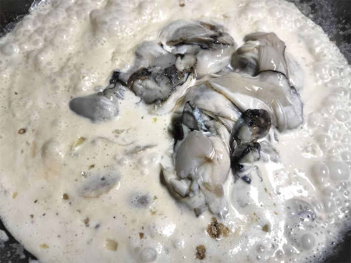 4. 玉ねぎがしんなりしたら、牛乳、生クリーム、オイスターソース、ハーブソルト、白こしょうを加えます。