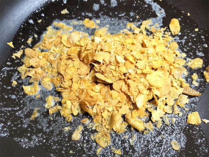 8. フライパンに残った油をペーパータオルで拭き、バター5gを入れて中火にしてコーンフレークを加えます。