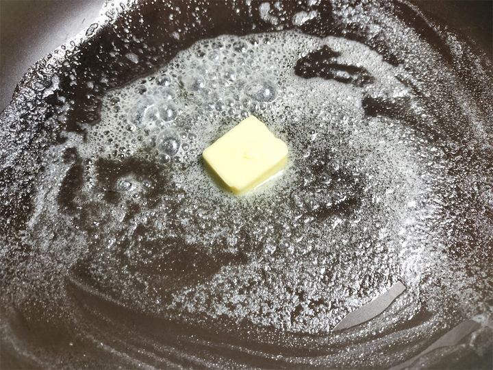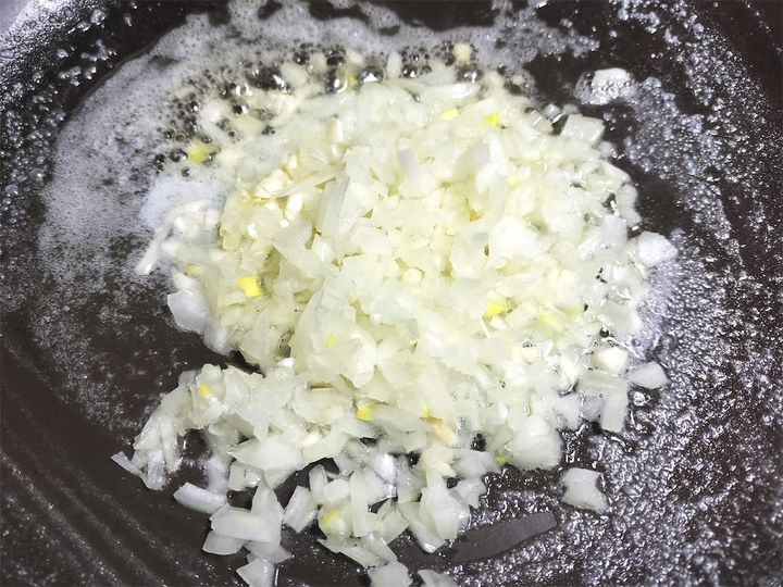 2. バターが溶けたら、にんにくと玉ねぎを加えて炒めます。
