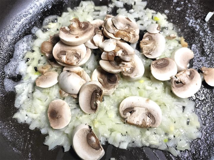 3. バターがなじんだら、マッシュルームを加えて炒めます。