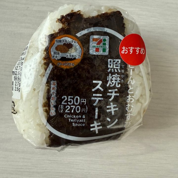 お惣菜で人気の照焼チキンステーキが入ったおにぎり。直火で焼き上げた甘辛い照焼チキンがどーんと入っています!