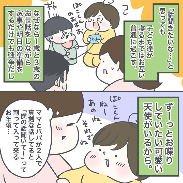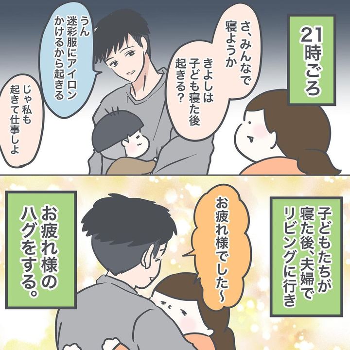 どんなに疲れていても、仕事で何か不快なことがあっても、子どもたちが寝るまではそのことに触れないぬぴさん夫妻の姿がとても素敵です。「お疲れ様のハグ」が、2人の時間の始まりを告げる合図になっているのですね。
