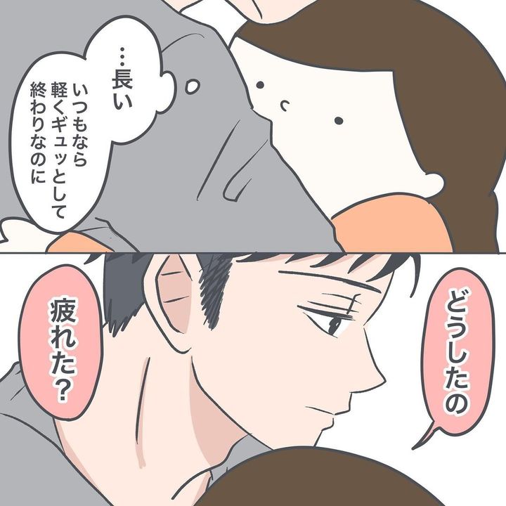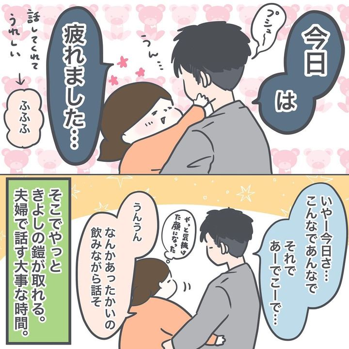 きよしさんが帰宅しても、元気がない様子のぬぴさん。子どもたちが寝るまではそのことに触れず、寝かしつけが終わった後、「お疲れ様のハグ」をして、夫婦2人でゆっくり話をする時間を設けるのでした。