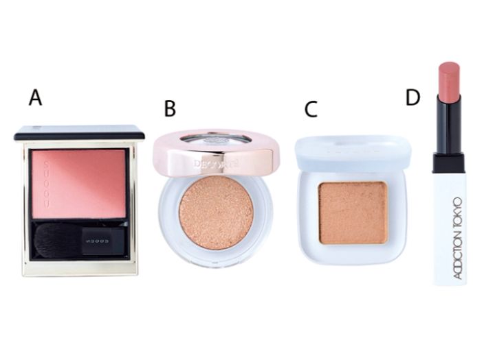 目元はCをアイホールに塗る。Bを目頭から下まぶたの黒目手前の位置まで塗り、ミニマムなきらめきを効かせてうるんだ瞳を演出。淡いピンクのDをひと塗りし、リップはナチュラルに仕上げる。