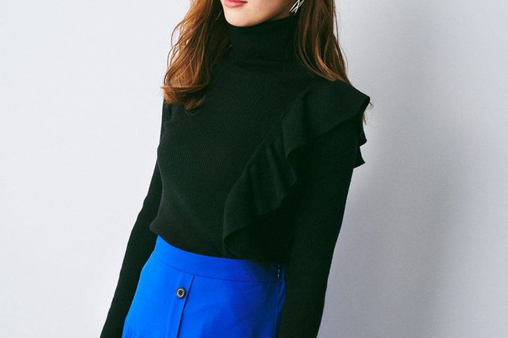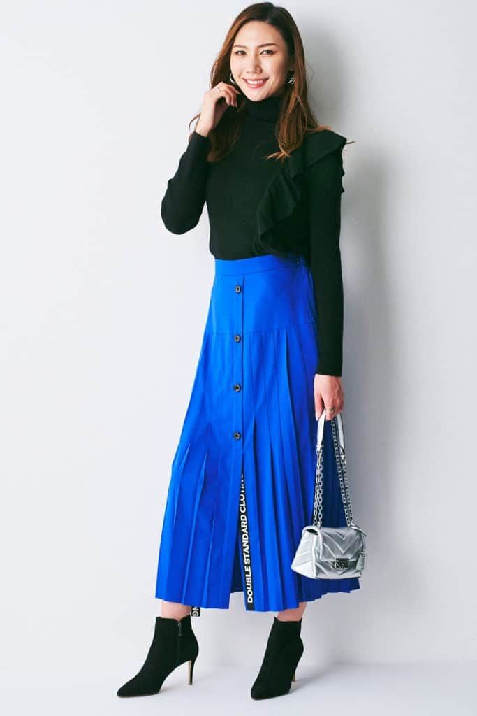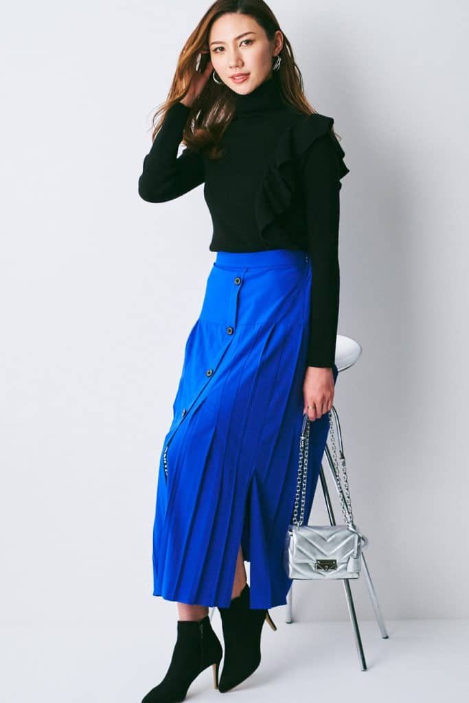 ハンサムでカッコいいスタイルをベースに、絶妙な女性らしさをトッピングした着こなしが得意です。トップスがタートルネックなら、スリット入りスカートで脚見せしてみたり。ワンピースなら裾がひらっと風になびきやすいものを選ぶとか。「バチェラー・ジャパン・シーズン3」の第1話の登場シーンでも着ていたワンピースと同じ、ロイヤルブルーカラーは昔から好きですね。パキっとした原色は季節問わず選びます。ベーシックな黒とも相性良く着られますよね」