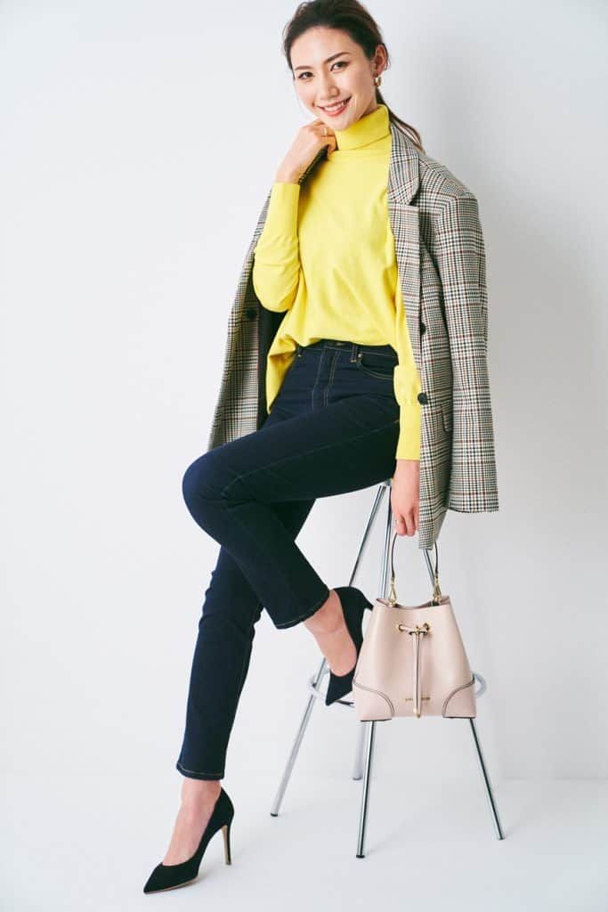 「ぱっと心が明るくなるような鮮やかな原色イエローも好き。パンツを履くなら、スキニーやストレートがほとんどです。ハイネックのトップスに合わせて、心が引き締まるようなポニーテールを。ヘアスタイルも雰囲気に合わせて変えています。ワイドパンツを履くときはトップスをタイトにするなど、トータルしてスマートなシルエットに仕上がるよう考えています」