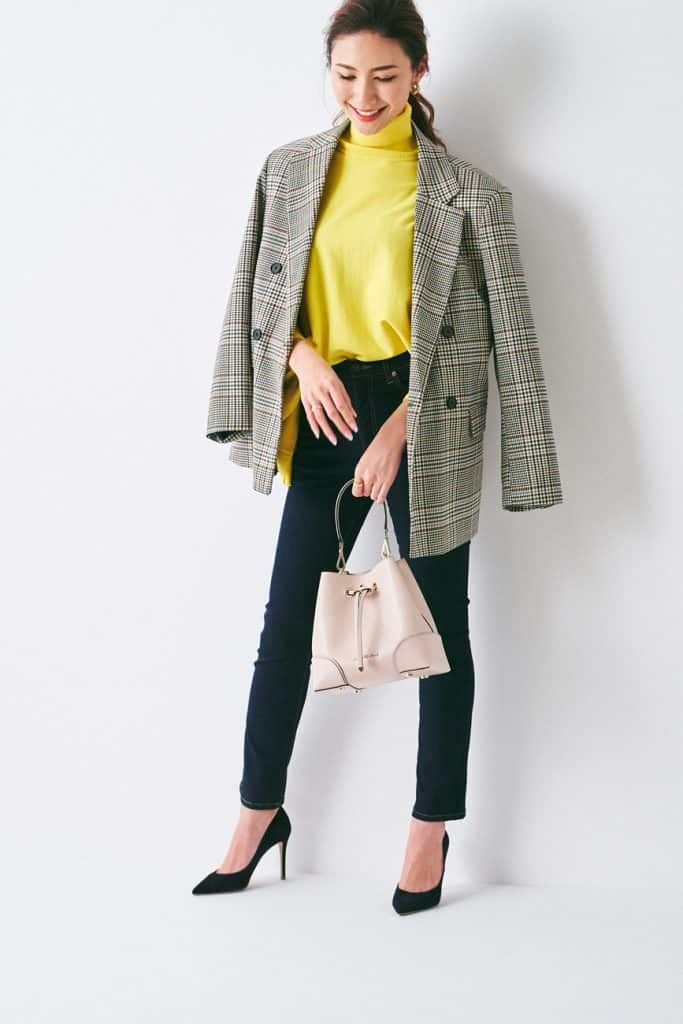 ジャケット¥6,355(ベルシュカ・ジャパン カスタマーサービス)タートルニット¥14,000(LE CIEL BLEU/ルシェルブルー 総合カスタマーサービス)スキニーデニム¥20,000(LOUNIE)バッグ¥46,000(マイケル マイケル・コース/マイケル・コース カスタマーサービス)パンプス¥14,500(ダイアナ/ダイアナ 銀座本店)ピアス※4つセット¥1.350(ストラディバリウス・ジャパン カスタマーサービス) ※ネックレスとリングは野原さん私物