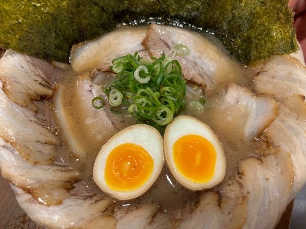 こちらは白ぼしとんこつラーメン(1300円)。鹿児島産のとんこつを16時間かけ旨味だけを残したスープはまったりとうま味が凝縮されている上にとんこつにありがちなクドさが全くありません。麺はストレートか縮れを聞いて下さります。豚骨はストレート麺を選びました。