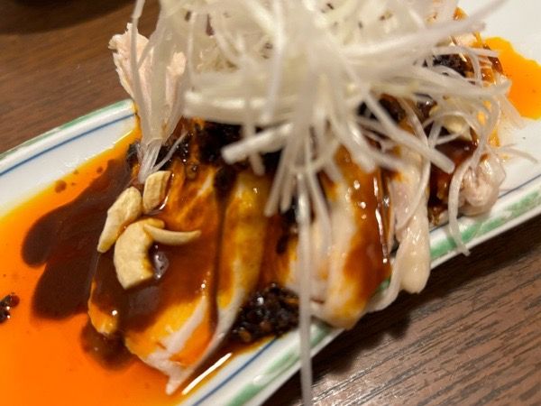 国産鶏むね肉のよだれ鶏もしっとりしていて自家製ラー油がピリッときいています。カシューナッツのカリカリっとした食感もよく合います。