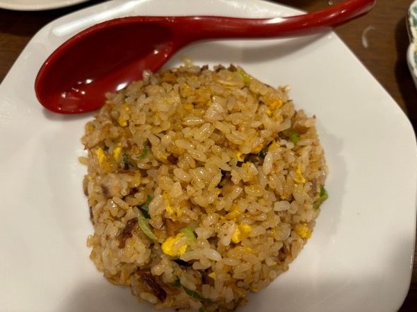 一口スープを口に運ぶとかつお節の良い香りが鼻に抜けていきます。パッと見た印象は濃そうに見えますがお出汁の濃厚な味にお箸が止まりません。魚節は縮れ麺を選びました。お得な満腹セットで半チャーハン(350円)をつけました。