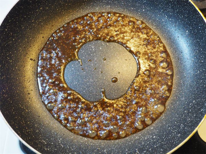 7. 6を取り出し、フライパンに残った油を軽く拭き取り、しょうゆ、みりん、酒、砂糖、うま味調味料を入れ、ひと煮立ちさせタレを作る。