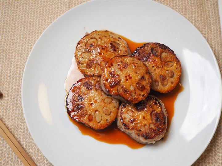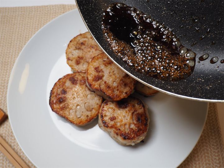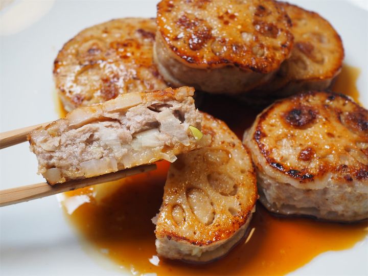 タレの甘じょっぱい香りが食欲をかき立てます。かぶりつくと、れんこんはシャキシャキの食感!しゃくしゃくというのが正しいでしょうか、れんこんの食感って唯一無二の特徴的な食感ですよね。お肉はマヨネーズやパン粉のおかげかふんわりとやわらかく、お箸で持って撮影しているとポタポタと肉汁が滴っていました。お肉のまろやかな旨味に甘じょっぱい照り焼きタレが相性抜群!しょうがの爽やかな香りと長ねぎの風味が効いていて、ぱくぱく食べてしまいました。