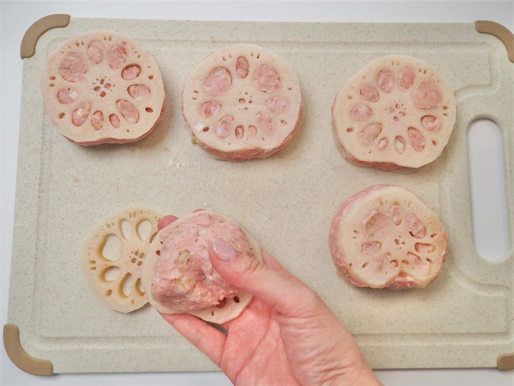 3. 【リュウジレシピ】しゃくしゃく&ふんわりジューシー♡「至高のレンコン挟み焼き」に挑戦!水煮使うと簡単♪