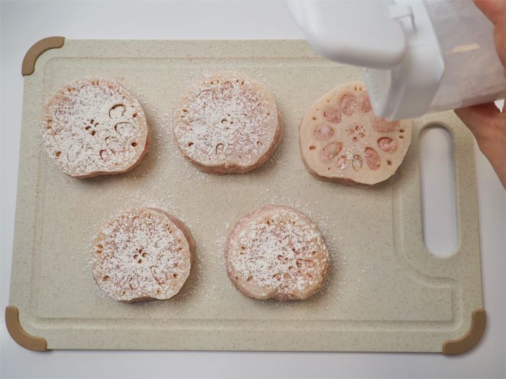 2. れんこんを0.5〜0.6mm幅に薄く切る。
