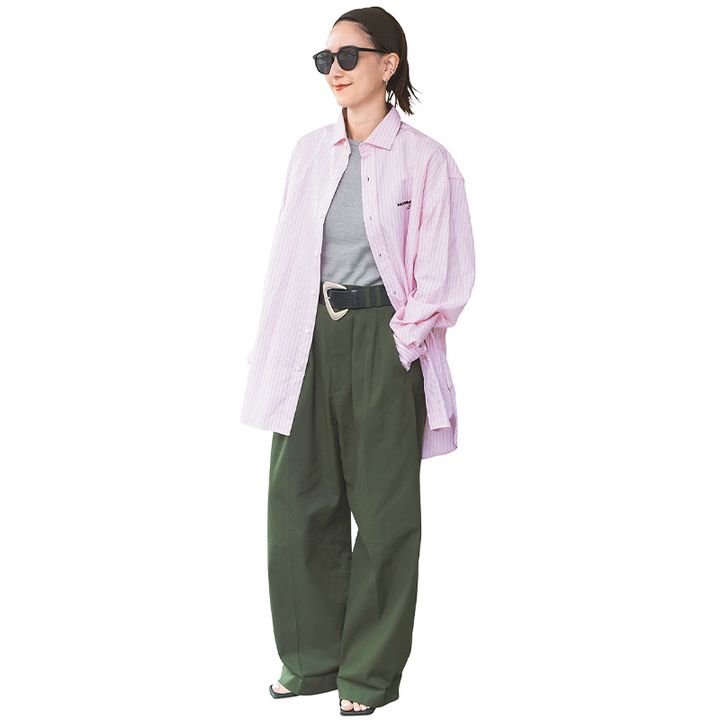 秋とはいえまだ暑いので、ピンクのストライプをチョイス。胸元のロゴとメンズライクなビッグシルエットが甘くなりすぎず新鮮なムードをプラス。6(ROKU)のワイドパンツや旬なヘアターバンなど、ちょい辛口アイテム投入でトレンドを意識しました。