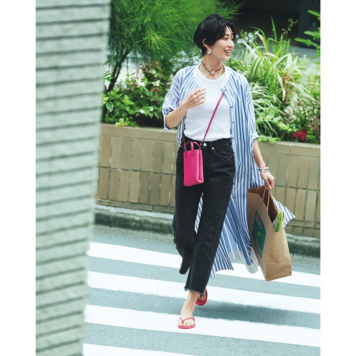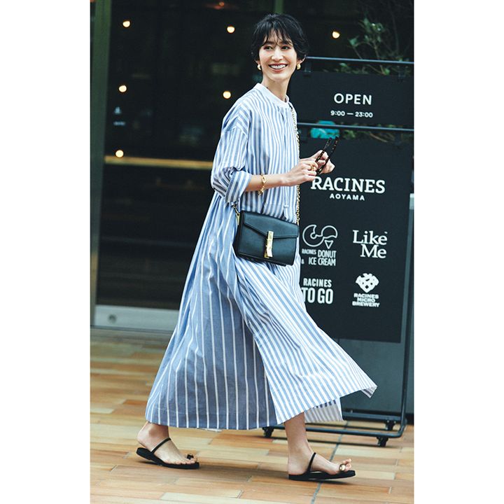 思考停止なバタバタの朝でも、ストライプのシャツワンピさえあれば自信をもって出かけられるはず!ワンピとして楽しむよそ行きシーンでは、黒小物で引き締めて大人顔に。スーパーへの買い出しでは、デニム×Tシャツに羽織るだけでラフさが軽減され、上品なこなれカジュアルに更新。