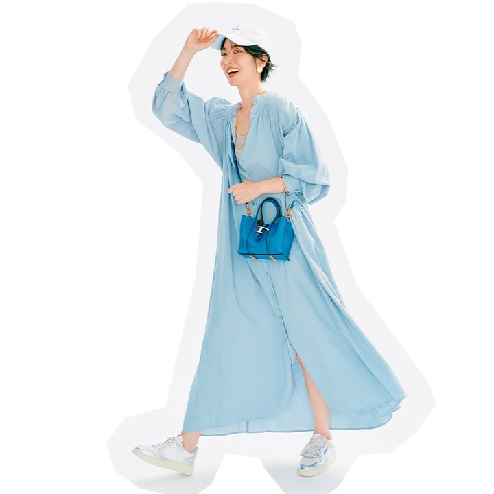 ティアードのロマンティックなムードを活かしつつ、襟付きのシャツデザインによりきれいめ印象を兼備する一着。足元に悩んだときは、やっぱりスニーカーが有効。ワンピとトーンの合ったマルチカラーのスニーカーなら浮きすぎず、上級者見えが叶います。